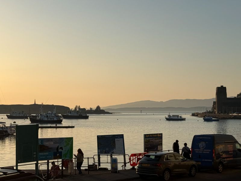 Oban är ingen stor stad och är centrerad runt sin lilla bukt med hamnen. Bara några steg från järnvägsstationen hittar man de första hotellen men vi valde att boka ett alldeles bortom hamnpromenaden, ut längs Corran Esplanade där små hotell och B&B:er ligger som ett pärlband. För oss var det priset som avgjorde. Vi var rätt sent ute och hittade ett erbjudande med middag första dagen till ett makalöst bra pris. Muthu Regent visade sig vara ett bra val för här, alldeles runt hörnet från livliga George Street och hamnen har man plötsligt öppen utsikt rakt ut mot ön Mull och det är här solnedgångarna kommer till sin helt egna rätt i staden för den som inte orkar upp till den kända amfiteatern.