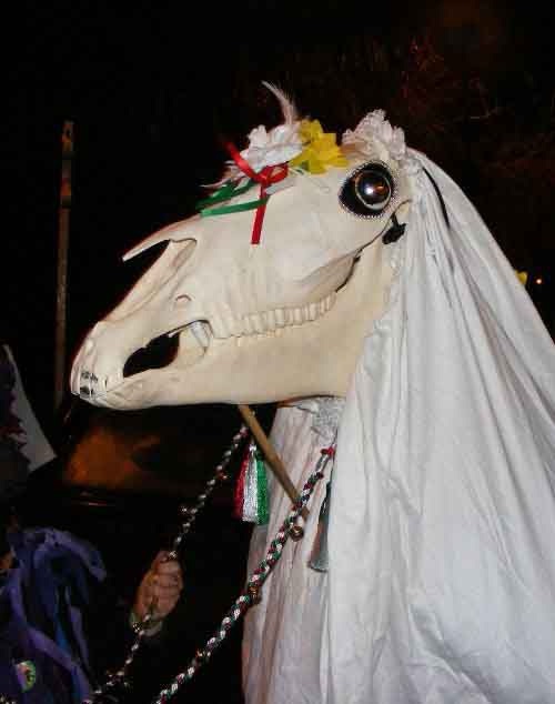 Den här traditionen ser du huvudsakligen i sydöstra Wales och dess engelska grannområden med början runt jul men framför allt efter nyår och traditionellt runt trettonhelgen. Det är en så kallad wassail vilket jag inte vet något bra motsvarande namn på i svenskan men det är ett samlingsord för en tradition som finns i mängder av länder, nämligen att under festliga tider vandra runt och ringa på hos folk och skåla för god hälsa. Själva ordet kommer av det anglosaxiska waes heil som betyder må väl och man skålar i kryddat ale, wassail. Med sig har man i just det här fallet en utsmyckad hästskalle på en påle så att den kan styras av en person under ett lakan.