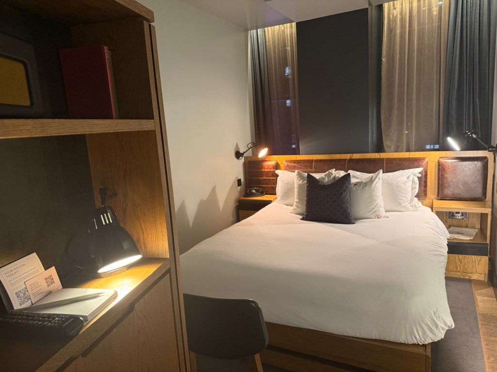 Jag bokade ett billigare rum av typen ”Snug” och för det förväntade jag mig ett litet trångt rum men det var inte alls som jag trodde. Litet och kompakt var det förvisso men sängen var trots det utstående i rummet och inte inklämd mot fönstren. Fint var det också men gardinerna var något svåra att dra för eftersom det gick en panel mellan säng och fönster. Först trodde jag inte att det fanns laddare vid sängen heller och förvånades att ett sådant socialt hotell inte hade det men så hittade jag uttagen långt in under bordsskivan till sängborden. Nästan så man får gå ner på knä om man inte har långa armar. Ett utfällbart litet skrivbord dolde en vattenkokare, te och kaffe och på hyllan (vill du ha något starkare finns det att köpa med i receptionen) ovanför stod en liten lampa. Ovanpå allt låg klassisk litteratur från antikvariat, i mitt fall Pilgrim Progress av John Bunyan och några andra. Badrummet med frostad glasdörr var litet men fräscht fast där märktes rummets storlek för toaletten var lite dumt vinklad mot duschen. Vattentrycket i handfatet var inte super men okej. Roligast med rummet var att varje gång du kom in så spelade en retro-radio på hyllorna avkopplande musik i någon minut. Jag sov bra i sköna sängkläder och bra säng. Det enda krånglet var nog att att alls hitta rummet innan jag insåg att numren stod på golvet och inte dörren!