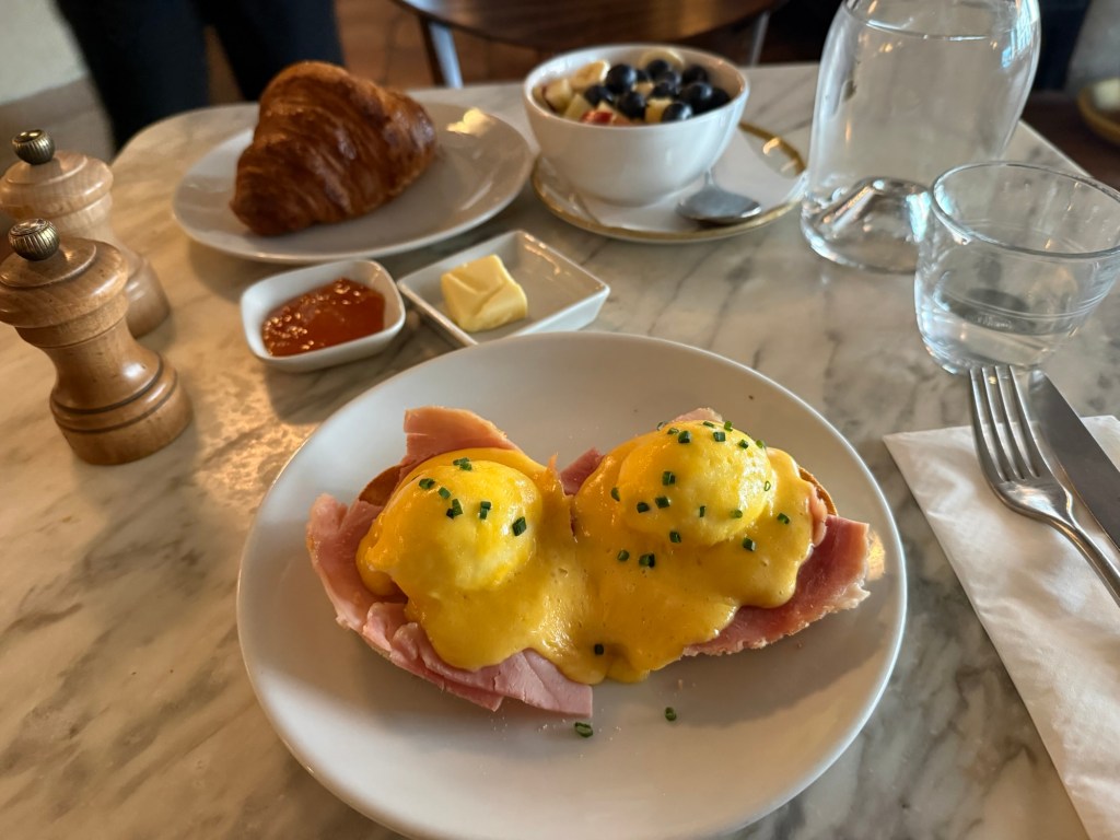 Frukost ingår inte för vad du gör här är att helt enkelt gå ner i hotellrestaurangen (som förövrigt har väldigt generösa öppettider) som serverar frukost fram till 10.30 på helgerna. Där beställer du helt enkelt det du vill ha från menyn och det gjorde jag för jag var såklart nyfiken denna enda natt och ville recensera. Det blev en god portion Eggs Benedict, granola och yoghurt med banan och blåbär samt en croissant med aprikosmarmelad. Allt var jättegott och personalen toppen.